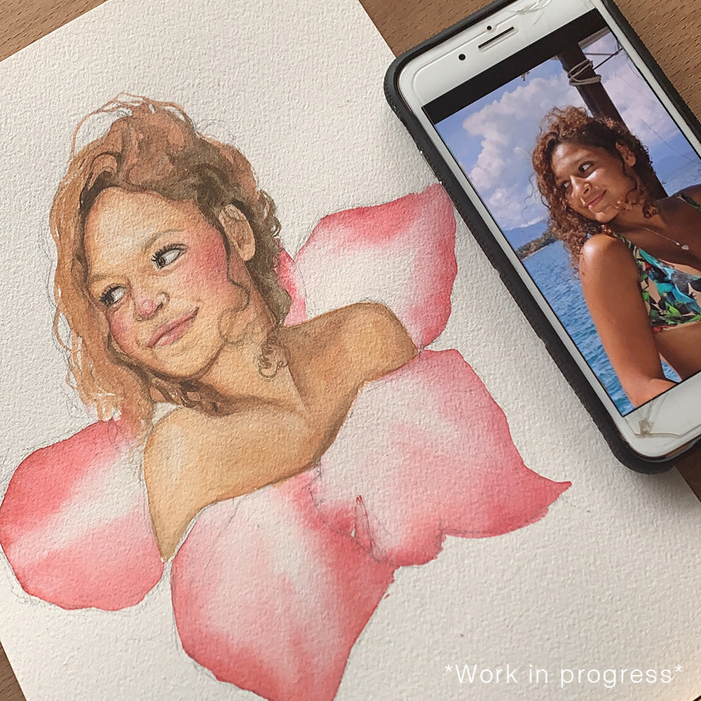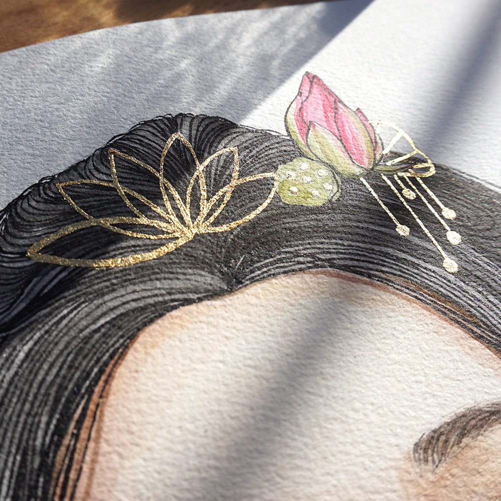 Painted on 300gsm watercolour paper with paints that last for 100+ years and embellished in real 24k gold leaf, let me capture you as the flowering goddess that you are!
